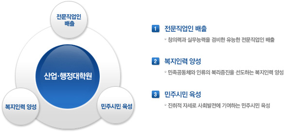 산업·행정대학원은 도덕적 품성과 전문지식을 겸비하고 국제화·전문화 사회를 선도하는 지도자 및 전문인을 양성하기 위해 석사학위과정 11개학과를 개설하였으며, 사회지도층의 전문지식을 재충전함으로써 고도의 지도자적자질을 함양하고 능력을 개발하여 국가경쟁력 제고와 선진국가 건설에 효율적·능동적으로 참여 할 수 있도록 교육기회를 제공한다.